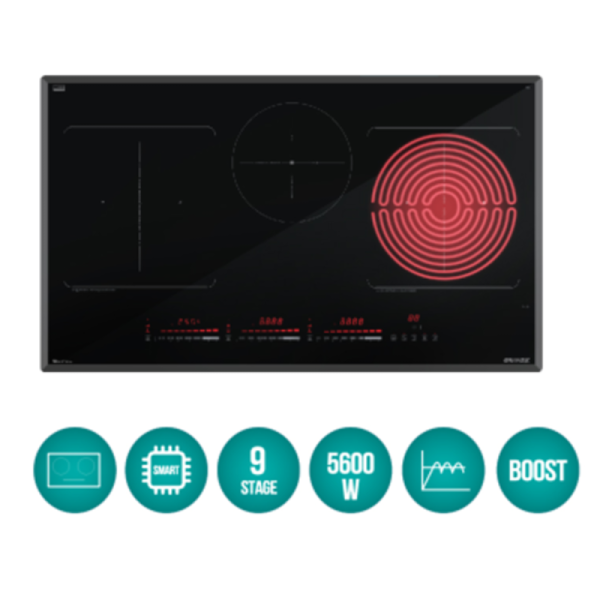 - Bảng điều khiển: Điều khiển trượt cảm ứng 15 levels mức công suất 3 vùng nấu độc lập