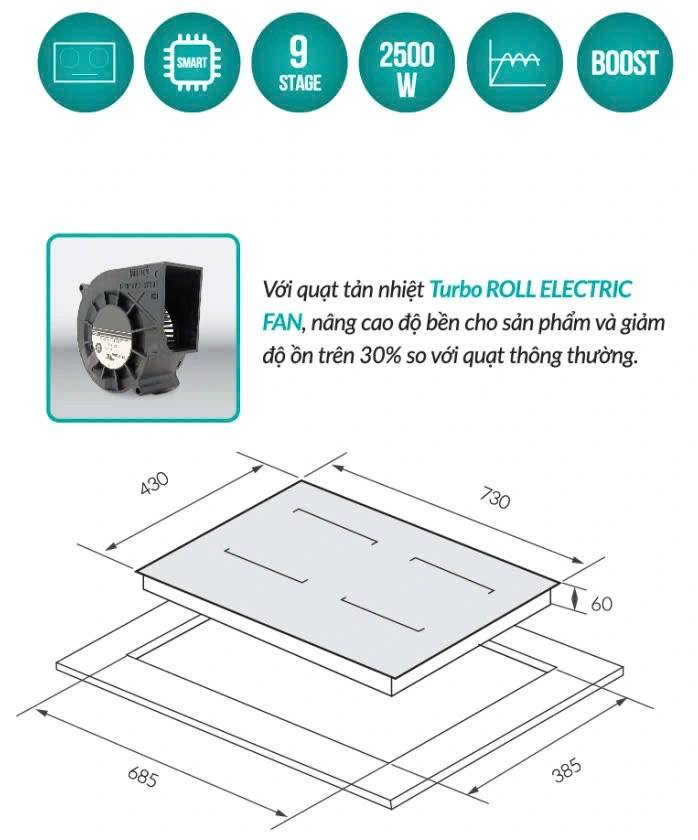 Mỗi vùng nấu của bếp có công suất 2000W, và được hỗ trợ chức năng Booster mạnh mẽ, cho phép tăng công suất lên đến 2500W trong thời gian ngắn. Chức năng này đặc biệt hữu ích khi bạn cần đun sôi nước hoặc nấu nhanh một lượng lớn thực phẩm, giúp tiết kiệm đáng kể thời gian vào bếp.