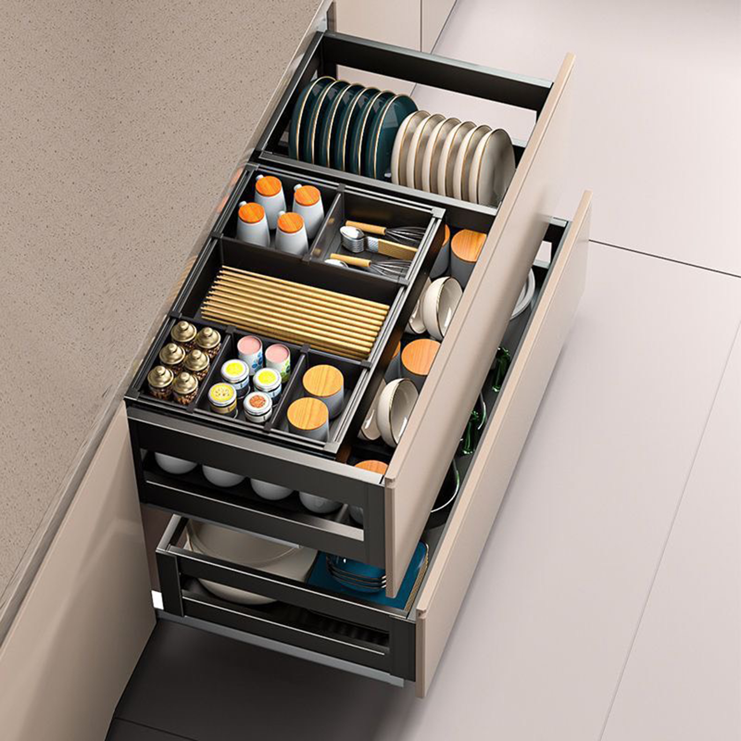 - Thiết kế ray âm còn giúp tăng tính thẩm mỹ cho tủ bếp, tạo sự gọn gàng và liền mạch.