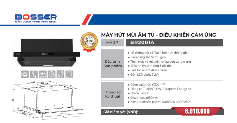 Thông Số Kỹ Thuật Chi Tiết Máy hút mùi Boss BR2001A