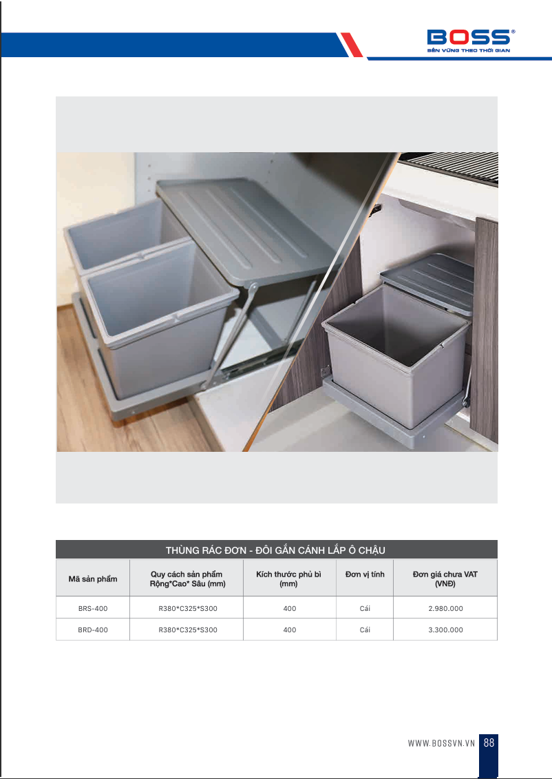 Thùng Rác Đôi Boss có kích thước tối ưu, dễ dàng lắp đặt trong các loại tủ bếp chuẩn. Kích thước của thùng rác lần lượt là R380 x C325 x S300 mm, với kích thước phủ bì là 400 mm. Sản phẩm này giúp tận dụng không gian một cách hiệu quả, mang lại sự ngăn nắp và gọn gàng cho căn bếp của bạn.