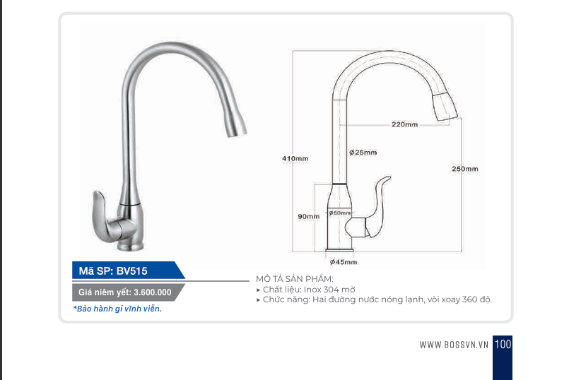 1. Thông Số Kỹ Thuật Vòi Boss Cố Định Xoay 360 Độ BV515